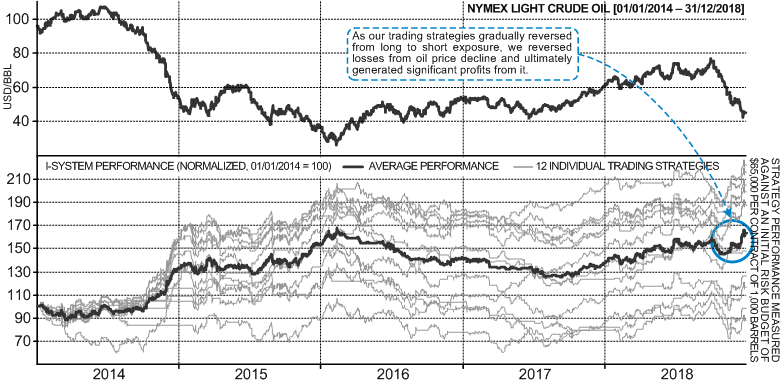 With the price correction unfolding, I-System strategies gradually reversed from long to short exposure, on average at $60.66/bbl on WTI and $69.04 on Brent and generated significant profits through 31 December 2018, as the following table details: