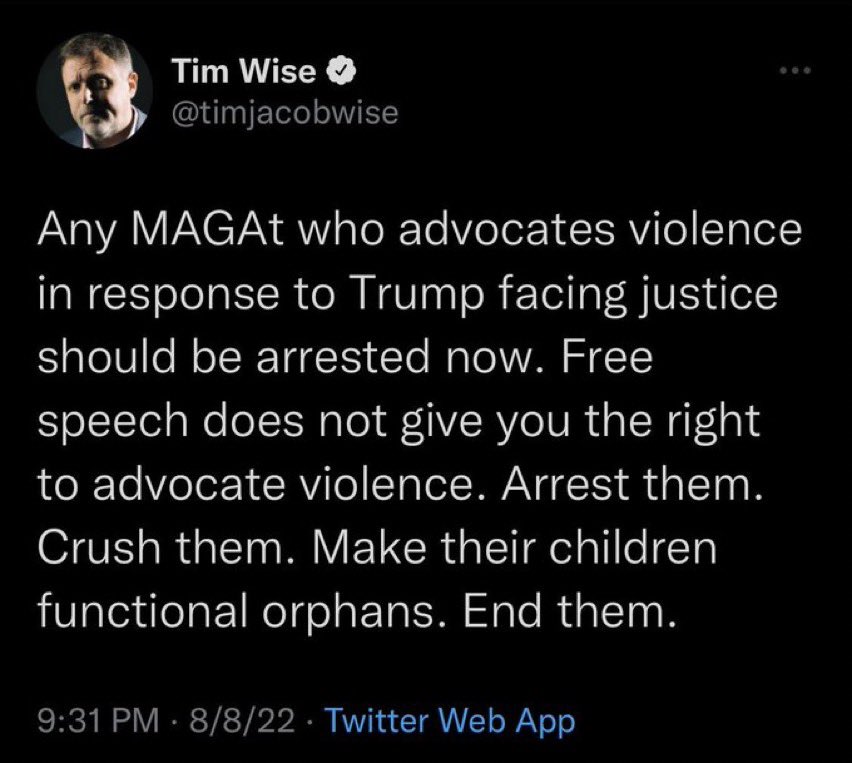 Since the FBI raid, social media have in fact exploded with calls for a crackdown on Trump supporters and conservatives in general. The sentiment was captured well by the popular author and „anti-racism activist“ Tim Wise in a (now deleted) Tweet: „Any MAGAt who advocates violence in response to Trump facing justice should be arrested now. Free speech does not give you the right to advocate violence. Arrest them. Crush them. Make their children functional orphans. End them.“